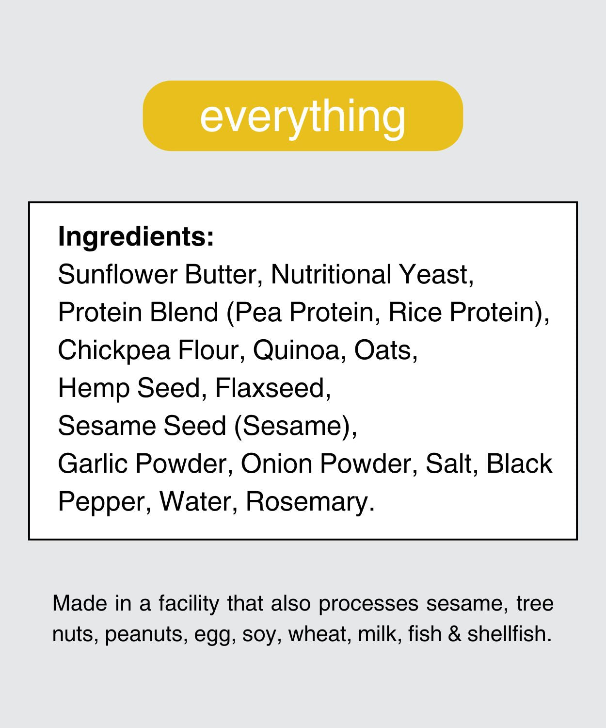 **Made in a facility that also processes sesame, tree nuts, peanuts, egg, soy, wheat, milk, fish & shellfish.**